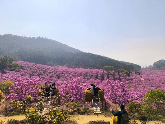 在园区,紫花风铃开满山,粉紫色的花球一团团、一簇簇,挂在枝头,随风摇曳,尽显冬日浪漫。媒体记者用无人机航拍花海、用镜头记录美好、用文字书写精彩,还通过现场报道和采访游客,述说绿美生态。