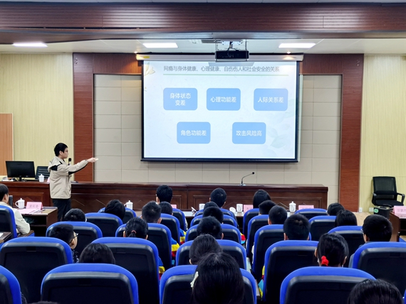 活动现场,江门市第三人民医院的心理治疗师黄创志医生结合生动鲜活的案例,向学生们分析了网络的便利和弊端,讲解网络成瘾的“脑科学”等知识,教育引导大家自查自纠,养成良好的网络使用习惯,培养健康心理和生活方式,构筑起预防网络成瘾的“心理防护墙”。