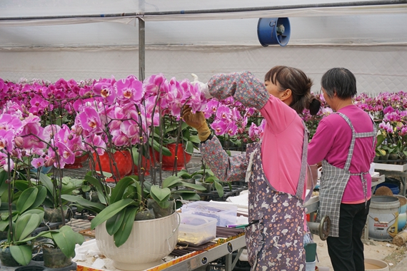 据了解,诚富兰花场是兰花专业种植基地,于1997年投资成立,占地250亩。如今,该花场建设有现代化管理温室大棚约5万平方米,培育了超100种蝴蝶兰品种,每年可培育超100万株兰花苗,销售情况持续稳定向好,年产值高达1000多万元。“我们供春节销售的兰花就有15万株左右。”李艳红介绍,由于建有自主培育基地,花场每年都会根据市场需求选育如“花蝴蝶”等多款新品种,这些品种兼具品相佳、花期长的优势,深受市场的欢迎。