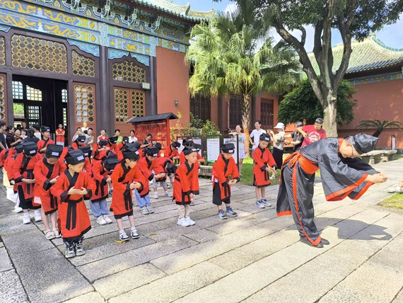 活动现场,30名身穿传统汉服的新学员到大成殿向孔子圣像行拜师礼。随后在领读人的引领下,齐声诵读《论语·八佾》篇,朗朗书声为新会学宫这座承载着深厚文化底蕴的古建筑增添了生机与活力。“从诵读《论语》中,我学会了为人处事的智慧和道理。”新学员梁栩婧表示。