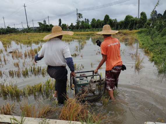 在崖门镇的水稻育秧场,大片秧苗被积水覆盖,大型抽水机持续作业向外排水。吴在敬现场指导农户:“除抓紧排水外,待积水退去后需及时喷洒杀菌剂消毒,防止病害蔓延,同时补充营养素和芸苔素等植物生长调节剂,帮助秧苗恢复生机。”