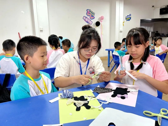 走进暑托班活动室,孩子们正围坐桌前专注创作,剪刀轻剪、胶水粘合间,企业生产剩下的彩色碎布边角料被拼贴成一幅幅童趣盎然的画作。这场变废为宝的手工活动,既锻炼了孩子们的动手能力与想象力,也悄然传递着环保理念,而这仅是暑托班丰富活动的一隅。为满足不同年龄段孩子的成长需求,企业专门聘请专业幼教老师设计课程,并安排职工家长轮班协助,开展绘本阅读、科普小课堂、兴趣绘画等多样化活动。