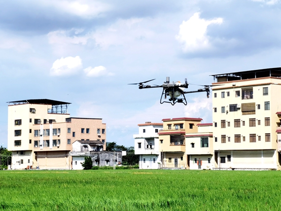 近日,记者来到崖门镇南合村看见,绿油油的稻田长势喜人。伴随着阵阵嗡鸣声,一辆植保无人机在种植户李国良的操控下,按照预设航线在稻田上空匀速飞行,均匀喷洒药液,为水稻披上了一层“防护衣”。“我们这里大概是1200亩水稻,现在到了水稻‘封行’(水稻枝叶相互遮挡,植株之间几乎没有间隙)的时期,也是进行第一次打药的时候。如今用无人机喷药大概一个星期就可以完成,相比以前人力喷药需时十多天,无人机大幅提升了效率。”李国良介绍说。