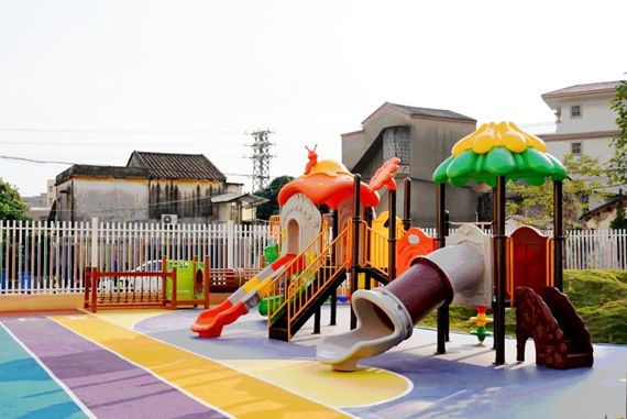 大泽镇中心幼儿园二期户外活动场地位于幼儿园西侧,占地面积约1200平方米,是根据孩子们的发展量身打造的“绿美成长乐园”。场地精心划分五大功能区域:活力游乐区有色彩缤纷的组合滑梯和安全稳固的体能组合器械;阳光足球场、成长跑道铺设厚实松软的环保橡胶地垫;沙水乐园配备多功能沙水组合玩具;小桥流水人家雅致清幽,搭配户外厨房、迷你烧烤台,可以静坐垂钓,可以围炉烧烤;自然探索区则是孩子们亲近自然、感知生命的“小课堂空间”。