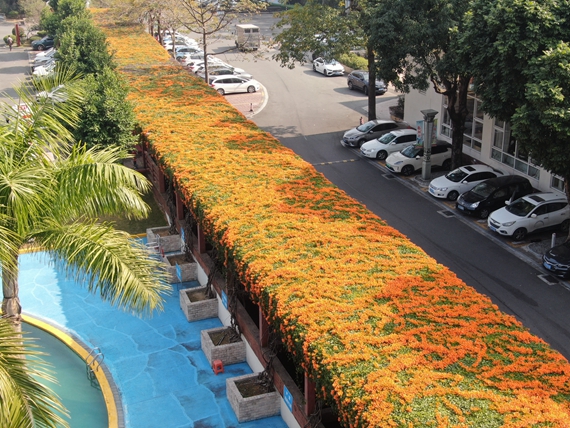 龙泉酒店的炮仗花长廊,花开如瀑。这些花朵形似爆竹,颜色橙红,喜气洋洋,在阳光下格外耀眼。