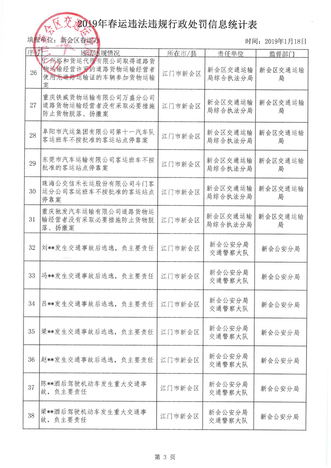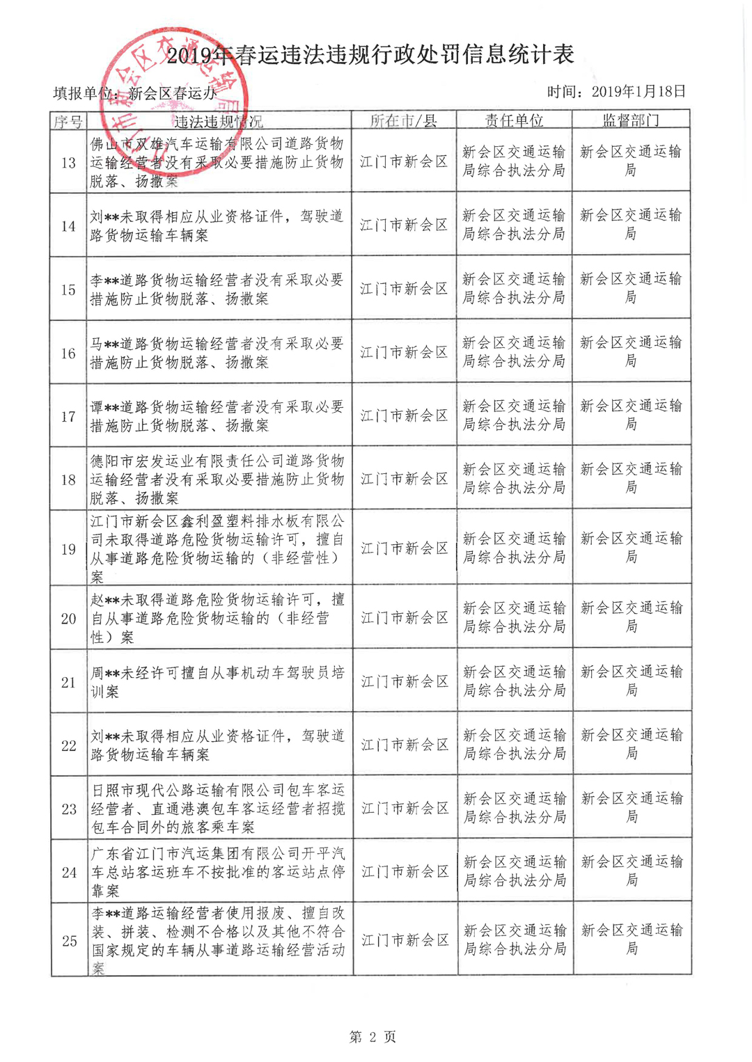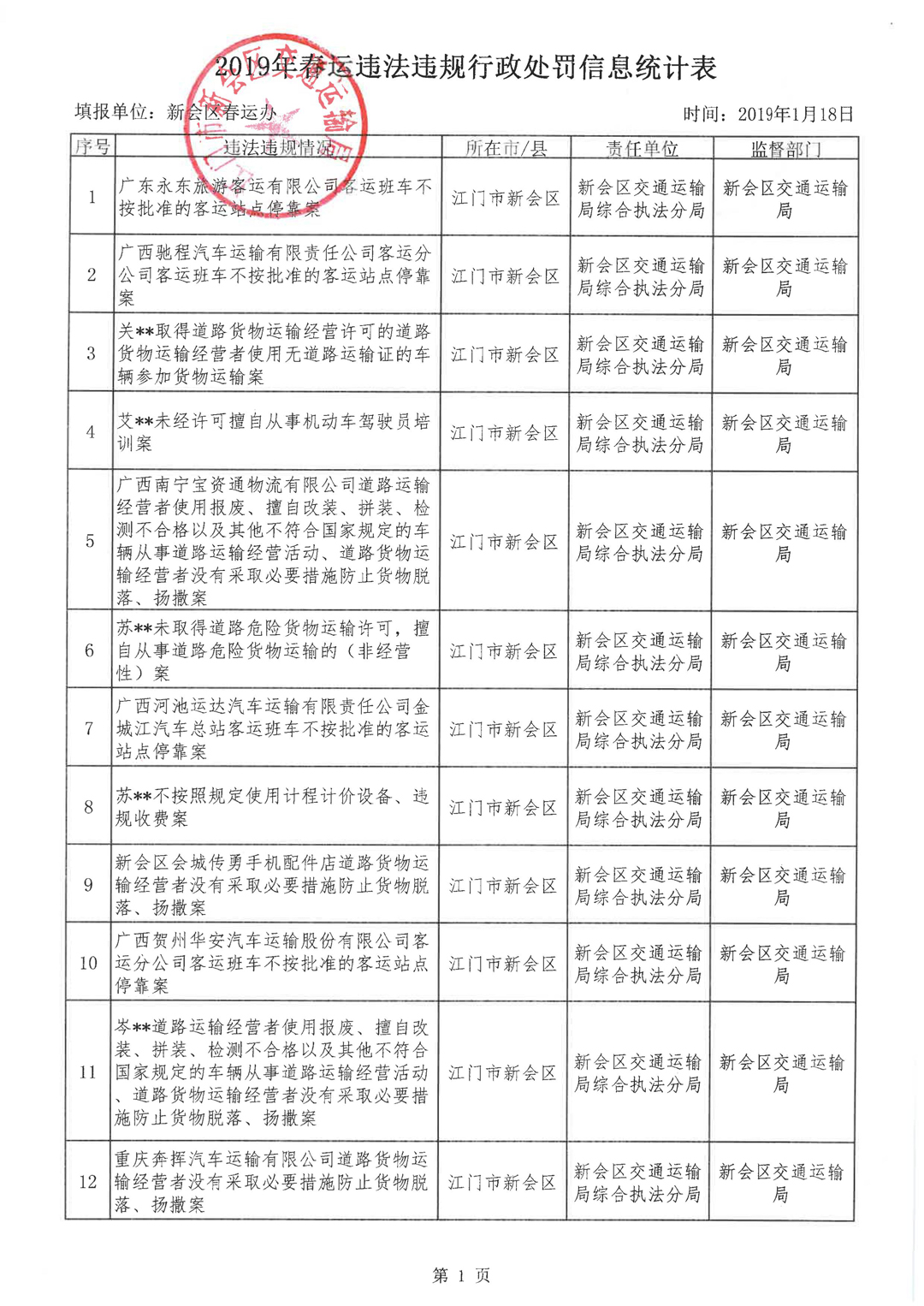 2019年春运违法违规行政处罚信息公开