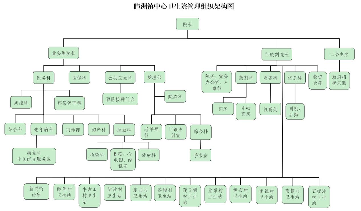 设有内科、外科、妇产科、儿科、五官科、口腔科、中医康复、老年病科、医技科(放射科、检验科、彩超、心电图、电子胃镜)等临床诊疗科室和公共卫生服务科。下辖有新兴街诊所、新沙卫生所、龙泉卫生所、黄布卫生所、南镇卫生所、莲腰卫生所、东向卫生所、石板沙卫生所8个卫生所,组成了一个有效的医疗保健网络,为全镇及邻近地区群众提供全科医疗服务。