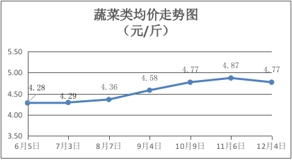 蔬菜类商品价格小幅回落。本期31种蔬菜价格波动情况为6涨16平9跌,综合零售均价为4.77元/斤,环比下降2.05%。6个品种零售均价环比上涨,其中:莴笋、椰菜、西红柿零售均价为每斤4.25元、3.50元、5.50元,环比上涨13.33%、7.69%、6.80%;9个品种零售均价环比下降,其中青瓜、芥兰、菠菜零售均价分别为每斤3.85元、5.00元、7.25元,环比分别下降18.95%、16.67%、12.12%。