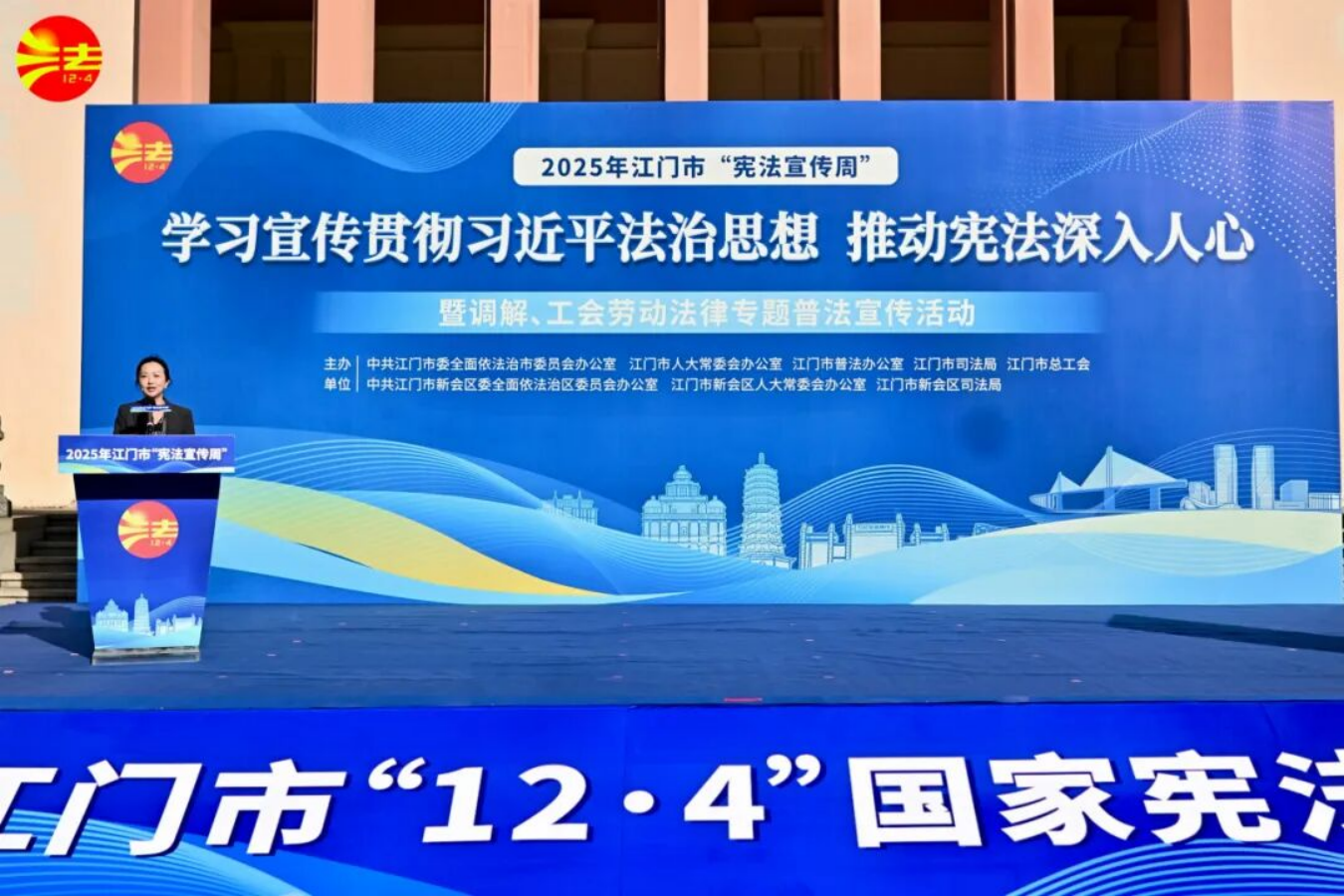 宪法声扬侨乡,法治暖润人心。11月29日上午,以“学习宣传贯彻习近平法治思想,推动宪法深入人心”为主题的江门市2025年度“国家宪法日”暨调解、工会劳动法律专题普法活动,在新会人民会堂前广场隆重举行。活动由市委依法治市办、市人大常委会办公室、市司法局、市总工会暨燕雨直播 委依法治区办、燕雨直播 人大常委会办公室、燕雨直播 司法局等联合主办。市、区重点普法单位代表悉数到场,40多家单位的普法志愿者参与普法宣传、法律咨询等活动,彰显了“大普法”格局的强大凝聚力。市、区两级司法局领导,市、区两级人大领导,区委政法委领导参加活动。