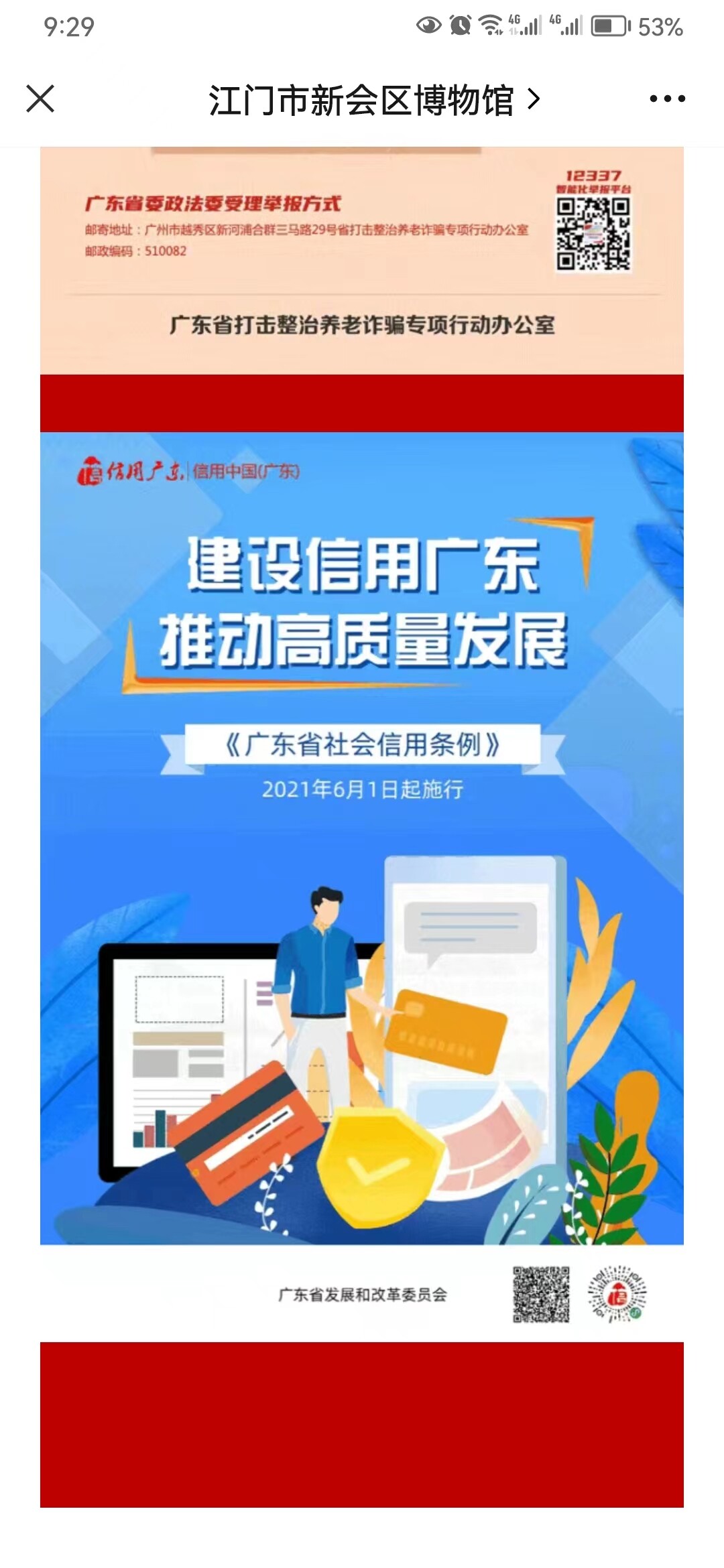 博物馆继续做好相关宣传工作,在博物馆大堂电视机循环播放宣传图片,张贴宣传海报,向前来参观的游客观众派发宣传资料,在微信公众号和网站上发布各类宣传资讯等,宣传诚信的重要性,积极引导全民树立信用意识。召开信用建设主题教育宣传工作会议,增强社会信用责任,培育信用体系文化。
