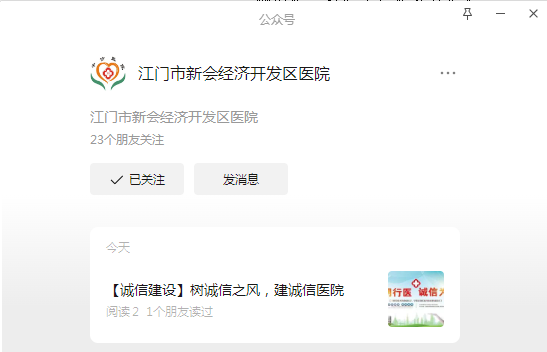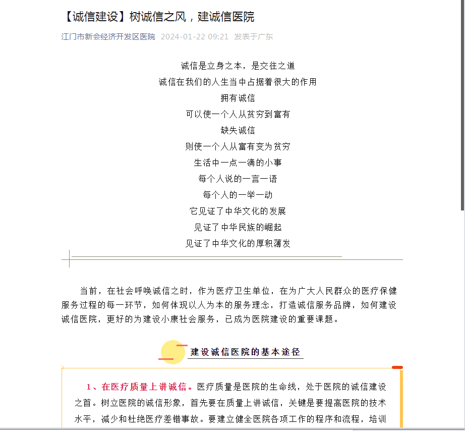 我区医院结合自身实际,通过内设LED流动字幕展示宣传标语,利用微信公众号转载解读国家和省、市有关诚信建设的法律法规和制度文件,广泛宣传诚信理念、诚信就医便民举措和诚信典型,引导广大群众积极发挥群众监督作用,加强诚信文化和诚信知识的普及。