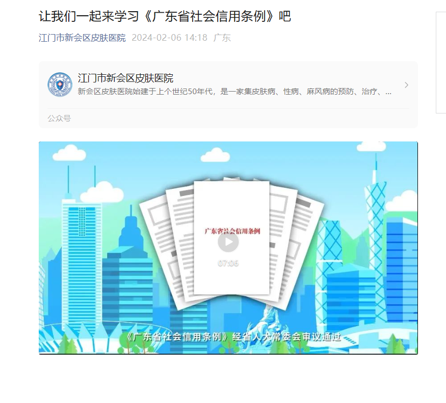 为进一步弘扬诚信文化,提高医院广大员工和群众的诚信意识,营造诚实守信的良好社会环境。区卫生健康局结合《关于印发<江门市医疗卫生信用信息管理工作实施方案>的通知》要求,以完善社会信用体系建设为基础,以加强信用监管为抓手,以建设诚信医院为着力点积极开展诚信文化宣传活动。