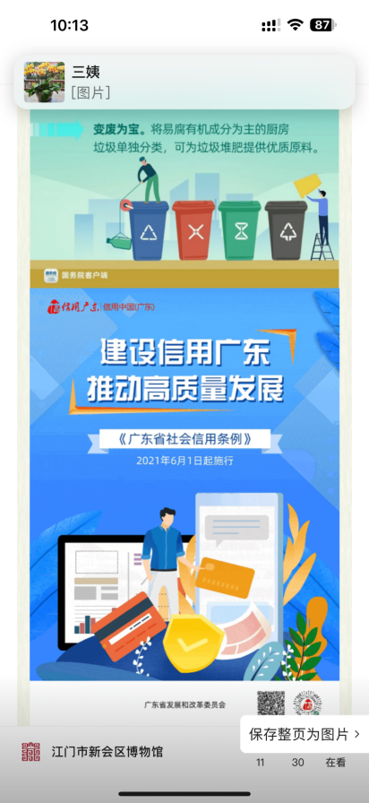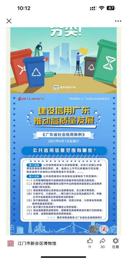 “人无信不立,国无信不兴”。为进一步培育和践行社会主义核心价值观,助力社会信用体系建设,营造人人讲诚信、处处讲信用的良好氛围,创造诚信守序、健康和谐的社会环境。新会博物馆持续开展诚信教育宣传活动,领导班子及全体员工认真学习《广东省社会信用条例》,细读弄懂关于社会信用环境建设、信息管理、守信激励与失信惩戒、主体权益保护、服务行业规范与发展等规定。同时继续做好其他相关宣传工作,一是利用本单位微信公众号、网站转发权威媒体关于信用建设方面的文章,普及信用知识。二是通过电子显示屏循环播放诚信建设标语和宣传图片,引导游客增强诚信意识,积极营造良好的诚信氛围。