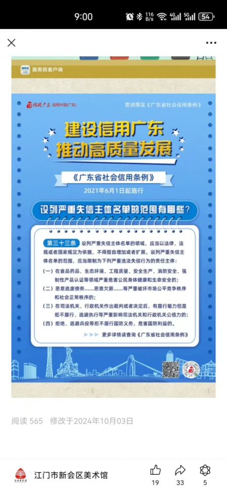 为助力社会信用体系建设,营造崇德向善、重信守诺的美德新风尚,构建诚实守信的社会健康环境,燕雨直播 美术馆持续开展诚信宣传活动。在美术馆网站、公众号发布相关诚信文化资讯以及在馆内公共区域LED显示屏循环播放《广东省社会信用条例》及宣传标语、图片,并在咨询服务台摆放《广东省社会信用条例》宣传小册子供市民取阅。