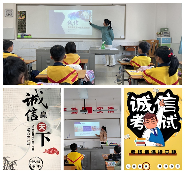 会上,老师们借助多媒体工具,向学生们展示“曾子杀猪”“商鞅立木为信”等经典诚信故事,以古鉴今,阐述诚信对于个人成长和社会发展的重要意义。在角色扮演环节,模拟生活中的诚信场景,如商场购物、借还物品等,让学生在实践中体验诚信的价值。随后,结合生活实际,列举身边的诚信事例和失信行为,如考试自律、物品归还以及考试作弊、抄袭作业、借钱不还等,组织学生进行讨论,同学们积极参与分享自己对诚信的理解和感悟。有的同学表示:“诚信是做人的根本,只有诚实守信,才能赢得他人的信任和尊重”。还有的同学说:“在学习和生活中,我们要时刻坚守诚信,从小事做起,做一个有道德、有优良品质的人”。