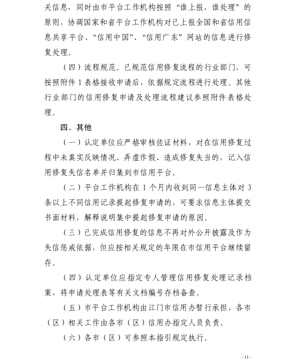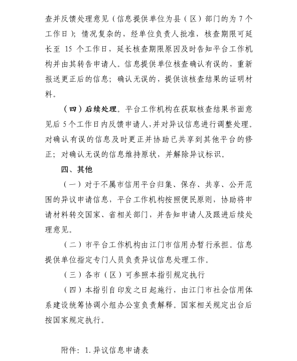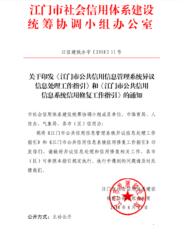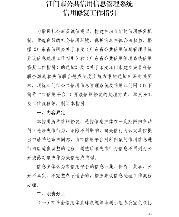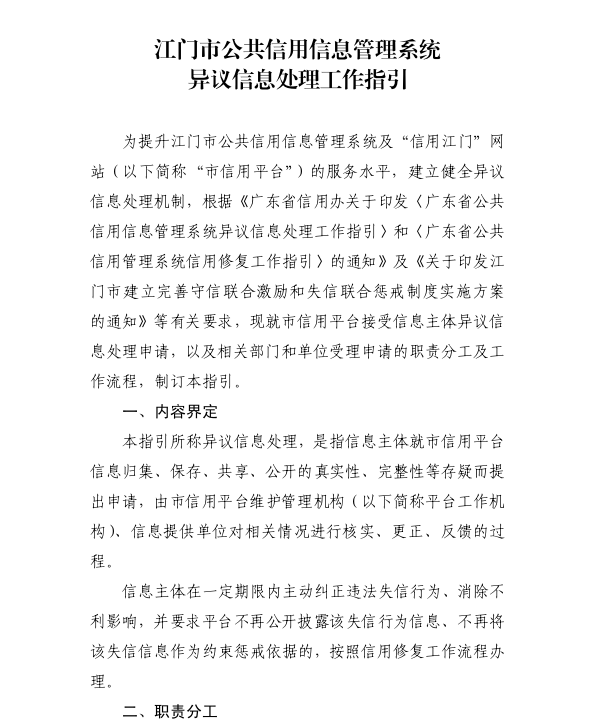 关于印发《江门市公共信用信息管理系统异议信息处理工作指引》和《江门市公共信用信息系统信用修复工作指引》的通知