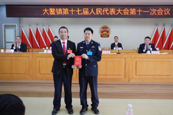 ▲镇党委书记阮耀森为新当选副镇长许连胜颁发当选证书