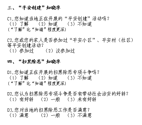 一句话了解平安三率(扫黑除恶知晓率)调查 ●“群众安全感”:是指群众对社会治安安全感满意度。 ●“政法工作满意度”:是指群众对政法队伍执法工作满意度。 ●“扫黑除恶知晓率”:是指群众对扫黑除恶(平安创建)工作的参与度和知晓率。