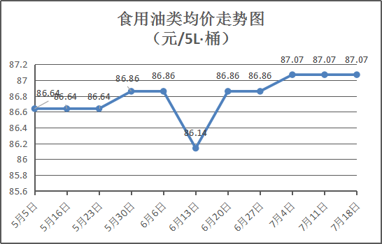 食用油价格保持平稳。本周所监测的9种食用油(5L装)商品均价为87.07元/桶,环比持平。金龙鱼花生油、大豆油、金龙调和油5L装零售均价分别为每桶112.50元、65元、73元,环比持平、持平、持平。