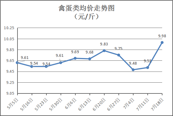 禽蛋类商品价格小幅上涨。本周所监测的6种禽蛋类商品均价为9.98元/斤,环比上涨4.90%。其中:白条鸡、白条鸭零售均价分别为每斤17元、14.50元,环比与上周分别上涨9.68%、7.41%;白壳鸡蛋、鸭蛋零售均价分别为每斤6元、7.65元,环比分别上涨2.56%、下降1.29%。