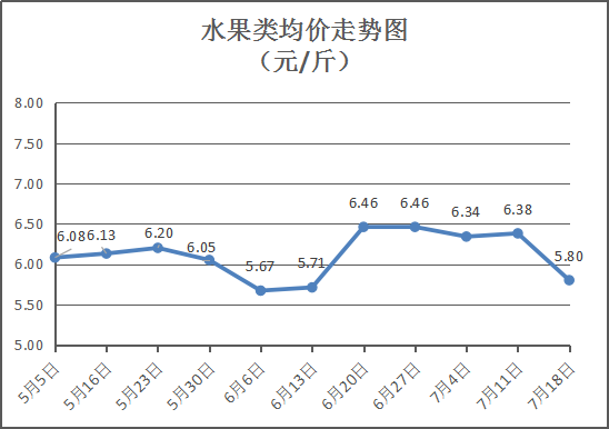 水果类商品价格下降。所监测的6种水果综合均价为5.80元/斤,环比下降9.02%。其中葡萄、西瓜、香蕉零售均价分别为每斤12元、1.80元、2.50元,环比分别下降20%、10%、9.09%。