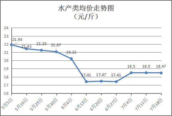 水产类商品价格略降。所监测的11种水产品综合均价为18.47元/斤,环比略降0.17%。其中:草鱼、鲫鱼、鳙鱼、基围虾零售均价分别为每斤10.25元、12.50元、10.50元、29元,环比分别上涨2.50%、下降10.71%、上涨5%、持平。
