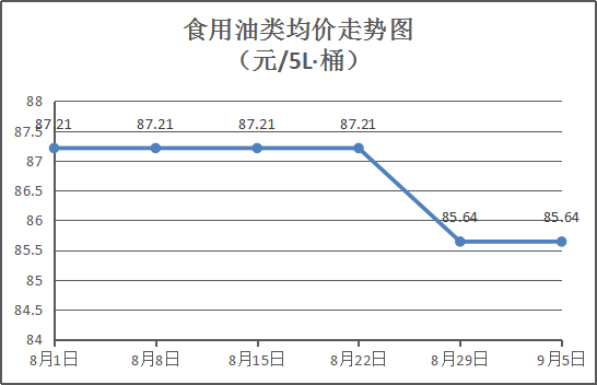 食用油类商品价格平稳。本周所监测的9种食用油(5L装)商品均价为85.64元/桶,环比均持平。其中:金龙鱼花生油、大豆油、金龙调和油5L装零售均价分别为每桶112.5元、65元、74元,环比与上周均持平。