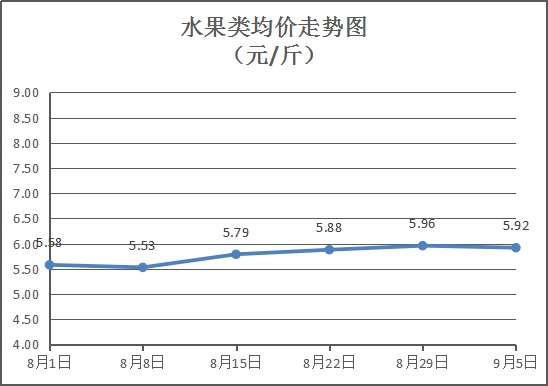 水果类商品价格窄幅微降。所监测的6种水果综合均价为5.92元/斤,波动情况为1跌5平,环比下降0.70%。其中:苹果、香蕉、西瓜、橙子零售均价分别为每斤7.25元、3元、2元、8元,环比与上周下降3.33%、持平、持平、持平。