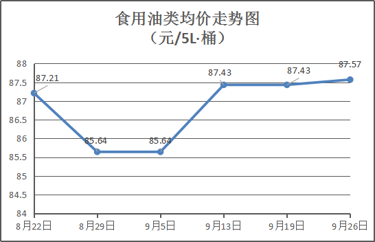 食用油类商品价格稳中微涨。本周所监测的9种食用油(5L装)商品均价为87.57元/桶,环比上涨0.16%。其中:金龙鱼花生油、大豆油、金龙调和油5L装零售均价分别为每桶113.5元、65元、74元,环比与上周分别上涨0.89%、持平、持平。