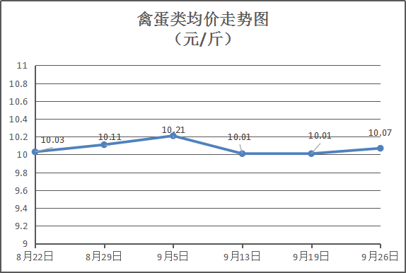 禽蛋类商品价格稳中微涨。本周所监测的6种禽蛋类商品均价为10.07元/斤,环比上涨0.58%。其中:白条鸡、白条鸭、白壳鸡蛋、鸭蛋零售均价分别为每斤16元、14.5元,6.75元、7.65元,环比与上周分别上涨3.23%、持平、下降2.17%、上涨2.0%。