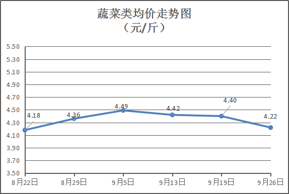 蔬菜类商品价格普遍下降。本周32种蔬菜价格波动情况为4涨13平15跌,综合零售均价为4.22元/斤,环比下降4.26%。其中:4个品种零售均价环比上涨,品种包括水东芥菜、白苋菜、韭菜零售均价分别为每斤3.75元、3.25元、4.5元,环比分别上涨7.14%、8.33%、5.88%;15个品种零售均价环比下降,品种包括本地菜心、菠菜、西红柿、白萝卜零售均价分别为每斤4.75元、6.75元、4.25元、2.25元,环比与上周分别下降17.39%、20.59%、15%、10%。