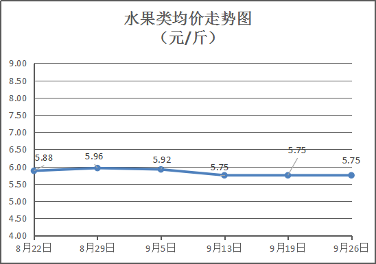 水果类商品价格基本平稳。所监测的6种水果综合均价为5.75元/斤,环比持平。其中:苹果、香蕉、西瓜零售均价分别为每斤7.5元、2.75元、2元,环比与上周分别上涨3.45%、下降8.33%、持平。