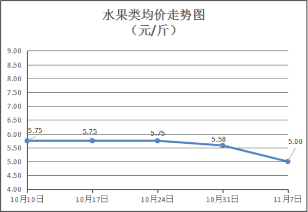 水果类商品价格普遍下降。所监测的6种水果综合均价为5元/斤,环比下降10.39%。其中:橙子、葡萄、梨零售均价分别为每斤4.75元、8元、5元,环比与上周分别下降20.83%、20%、4.76%。