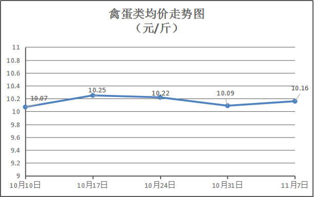 禽蛋类商品价格窄幅盘整。本周所监测的6种禽蛋类商品均价为10.16元/斤,环比上涨0.69%。其中:白条鸡、白条鸭、白壳鸡蛋、鸭蛋零售均价分别为每斤15.5元、15元,6.9元、8.15元,环比与上周分别下降3.13%、上涨3.45%、持平、上涨5.16%。