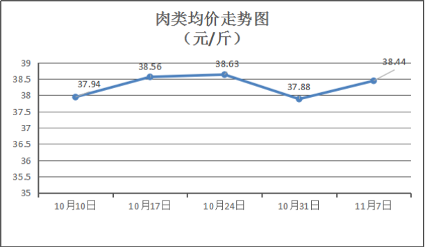 肉类商品价格略有上涨。本周所监测的8种肉类商品均价为38.44元/斤,环比上涨1.48%。其中:排骨、有皮上肉、牛腩、带骨羊肉零售均价分别为每斤37.5元、20.5元、54元、49元,环比与上周分别下降1.32%、持平、上涨4.85%、上涨3.16%。
