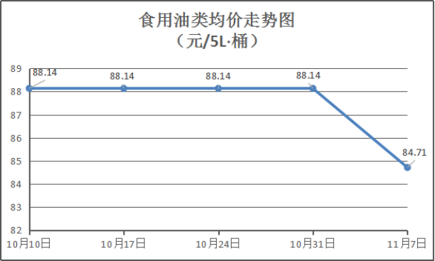 食用油类商品价格稳中有降。本周所监测的9种食用油(5L装)商品均价为84.71元/桶,环比下降3.89%。其中:金龙鱼花生油、大豆油、金龙调和油5L装零售均价分别为每桶115元、65元、74元,环比与上周分别下降2.13%、持平、持平。