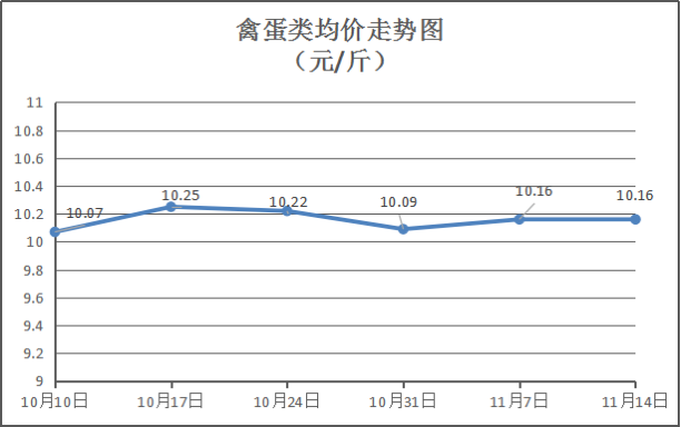 禽蛋类商品价格平稳。本周所监测的6种禽蛋类商品均价为10.16元/斤,环比均持平。其中:白条鸡、白条鸭、白壳鸡蛋、鸭蛋零售均价分别为每斤15.5元、15元、6.9元、8.15元,环比与上周均持平。
