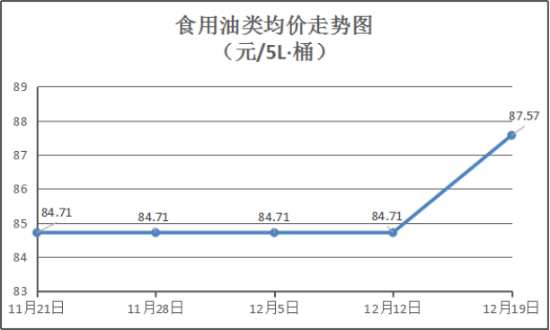 食用油类商品价格稳中有涨。本周所监测的9种食用油(5L装)商品均价为87.57元/桶,环比上涨3.38%。其中:金龙鱼花生油、大豆油、金龙调和油5L装零售均价分别为每桶115元、65元、74元,环比与上周持平。