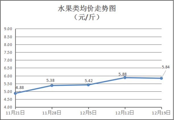 水果类商品价格略有下降。所监测的6种水果综合均价为5.84元/斤,环比下降0.68%。其中:橙子、苹果、梨零售均价分别为每斤5.50元、6.75元、4.50元,环比与上周分别下降4.35%、下降3.57%、下降10%。