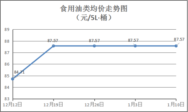 食用油类商品价格稳定。本周所监测的9种食用油(5L装)商品均价为87.57元/桶,环比均持平。其中:金龙鱼花生油、大豆油、金龙调和油5L装零售均价分别为每桶115元、65元、74元,环比与上周均持平。