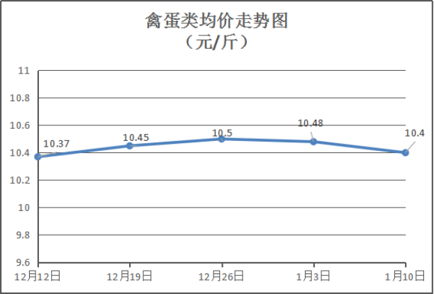 禽蛋类商品价格略有下降。本周所监测的6种禽蛋类商品均价为10.40元/斤,环比下降0.76%。其中:白条鸡、白条鸭、白壳鸡蛋、鸭蛋零售均价分别为每斤15.50元、15.50元、7.30元、8.25元,环比与上周分别持平、持平、下降1.35%、下降1.79%。