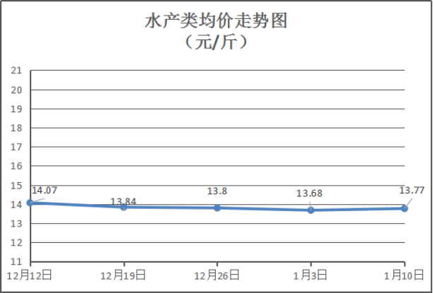 水产类商品价格微幅上涨。所监测的11种水产品综合均价为13.77元/斤,环比上涨0.66%。其中:草鱼、鲫鱼、鲈鱼、基围虾零售均价分别为每斤11.50元、12.75元、20.00元、33元,环比与上周分别上涨4.55%、持平、上涨2.56%、持平。