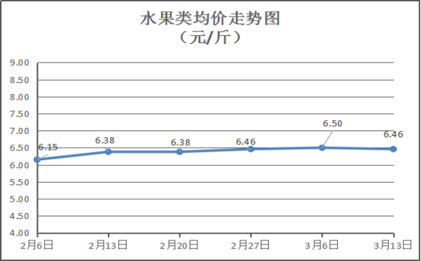 水果类商品价格下降。所监测的6种水果综合均价为6.46元/斤,环比下降0.62%。其中:橙子、苹果、梨零售均价分别为每斤6.00元、7.75元、5.50元,环比与上周分别下降4.00%、上涨3.33%、持平。