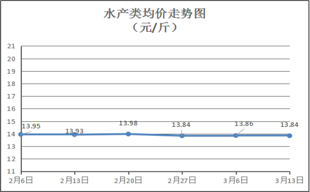 水产类商品价格微幅下降。所监测的11种水产品综合均价为13.84元/斤,环比下降0.14%。其中:草鱼、鲫鱼、黄鱼、基围虾零售均价分别为每斤11.25元、12.50元、21.50元、35.00元,环比与上周分别下降2.17%、持平、持平、下降2.78%。