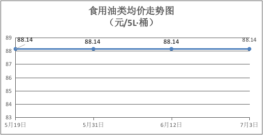 食用油类商品价格平稳。本期所监测的9种食用油(5L装)商品均价为88.14元/桶,环比持平。其中:鲁花花生油、菜籽油、玉米油零售均价分别为每桶158元、74元、73元,环比分别持平。