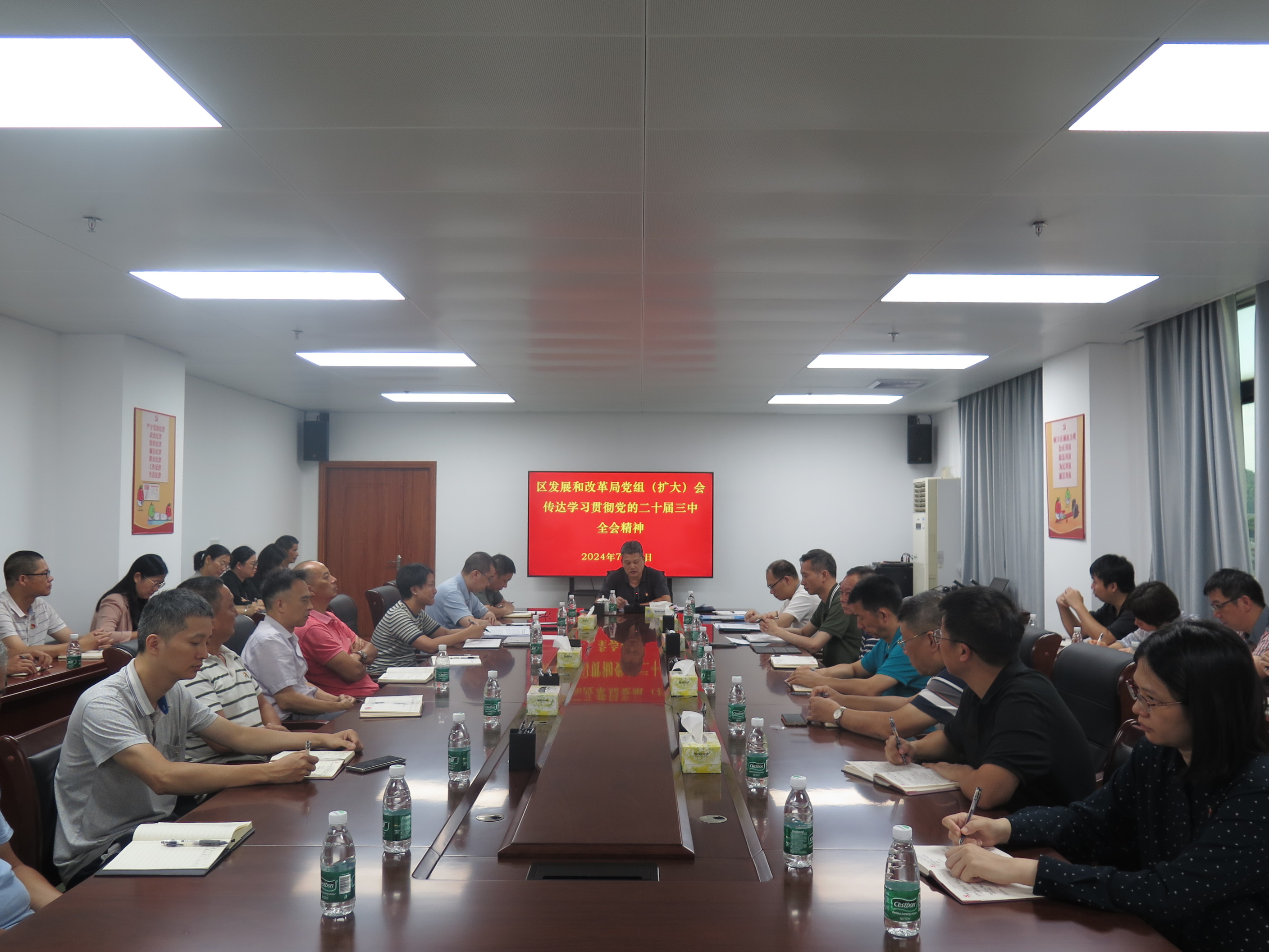 7月25日下午,区发展和改革局党组书记、局长陈振平同志主持召开党组(扩大)会议,传达学习贯彻习近平总书记在党的二十届三中全会上的重要讲话精神和全会精神,以及省、市、区有关会议精神,研究部署学习宣传贯彻工作。局领导及机关各股室副股职以上干部及下属事业单位、托管国有企业负责人参加会议。