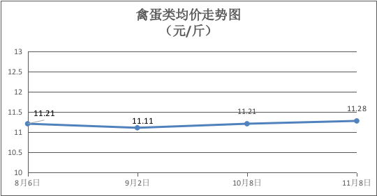 禽蛋类商品价格小幅上涨。本期所监测的5种禽蛋类商品均价为11.28元/斤,环比上涨0.62%。其中:鸡肉、鸡蛋零售价为每斤17.50元、6.75元,持平、环比上涨5.47%。