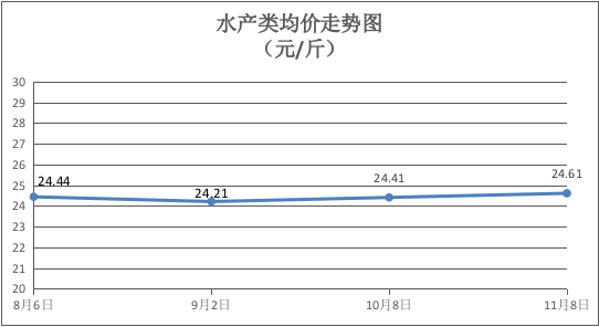 水产类商品总体价格稳中有升。所监测的20种水产品综合均价为24.61元/斤,环比上涨0.82%。其中:黄花鱼、淡水鲈鱼、罗氏虾、基围虾、草鱼零售均价分别为每斤22.00元、19.50元、43.00元、30.00元、11.00元,持平、持平、环比下降4.44%、持平、环比上涨10%。