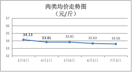 肉类商品价格轻微下降。本期所监测的8种肉类商品均价为33.56元/斤,环比下降0.21%。其中:排骨、精瘦肉、五花肉、牛肉、带骨羊肉零售价分别为每斤29.00元、18.50元、15.50、48.00元、47.50元,环比分别上涨1.75%、下降2.63%、下降3.13%、持平、持平。
