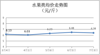 水果类商品价格小幅回落。所监测的6种水果综合均价为6.38元/斤,环比下降1.54%。其中:橙子、香蕉、葡萄、西瓜零售均价分别为每斤5.00元、3.00元、14.00元、3.25元,环比分别下降7.41%、下降4.76%、持平、下降2.99%。